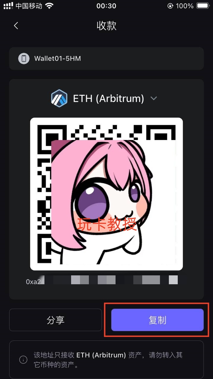 就会看到我们:Safepal钱包的Arbitrum链地址,我们点击复制,然后到交易所买2U的ETH,如果钱包有就不用购买