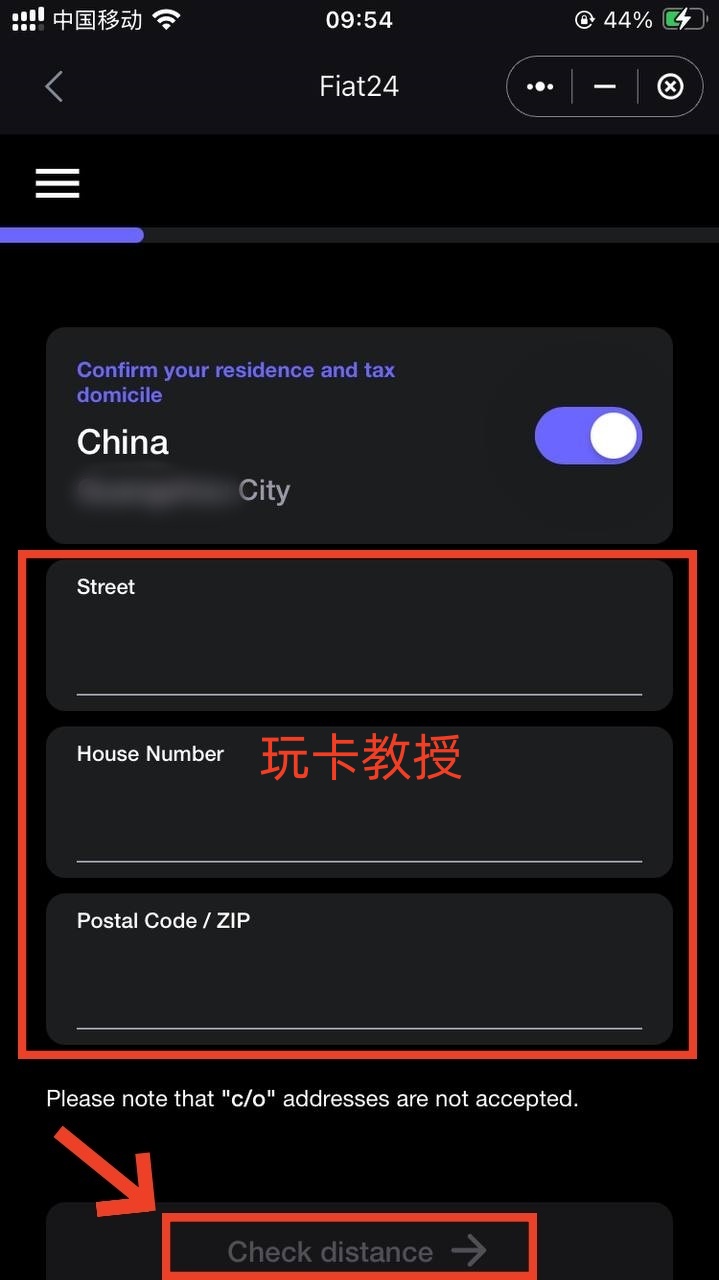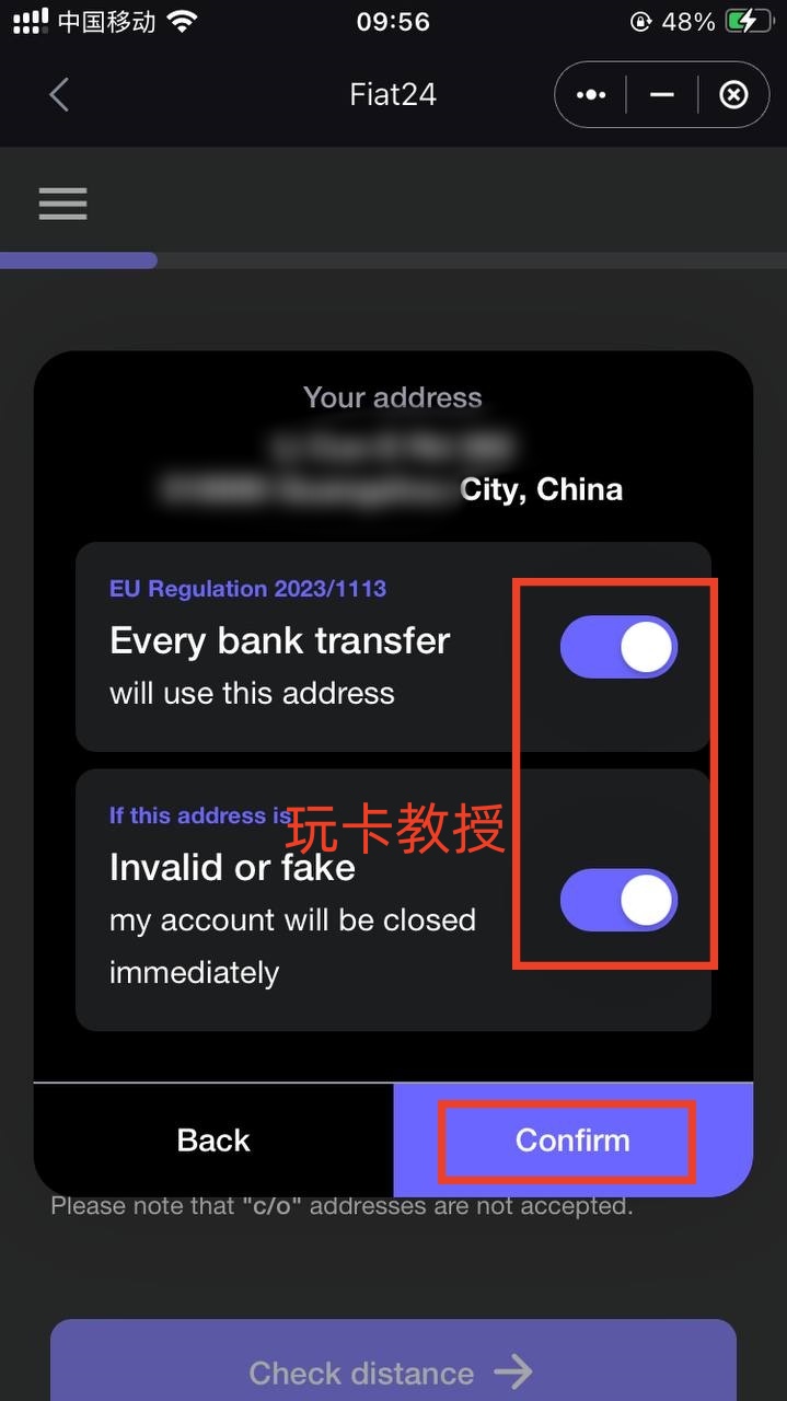 税务所在中国勾选,这里我选择:passport(护照)认证,你也可以选择身份证验证,选择护照后,会要求你补充完整地址,填写完地址后,点击:Check distance,弹框提示:每次银行转账使用改地址,地址无效或虚假立即关闭账户,两个都勾选上,点击:Confirm