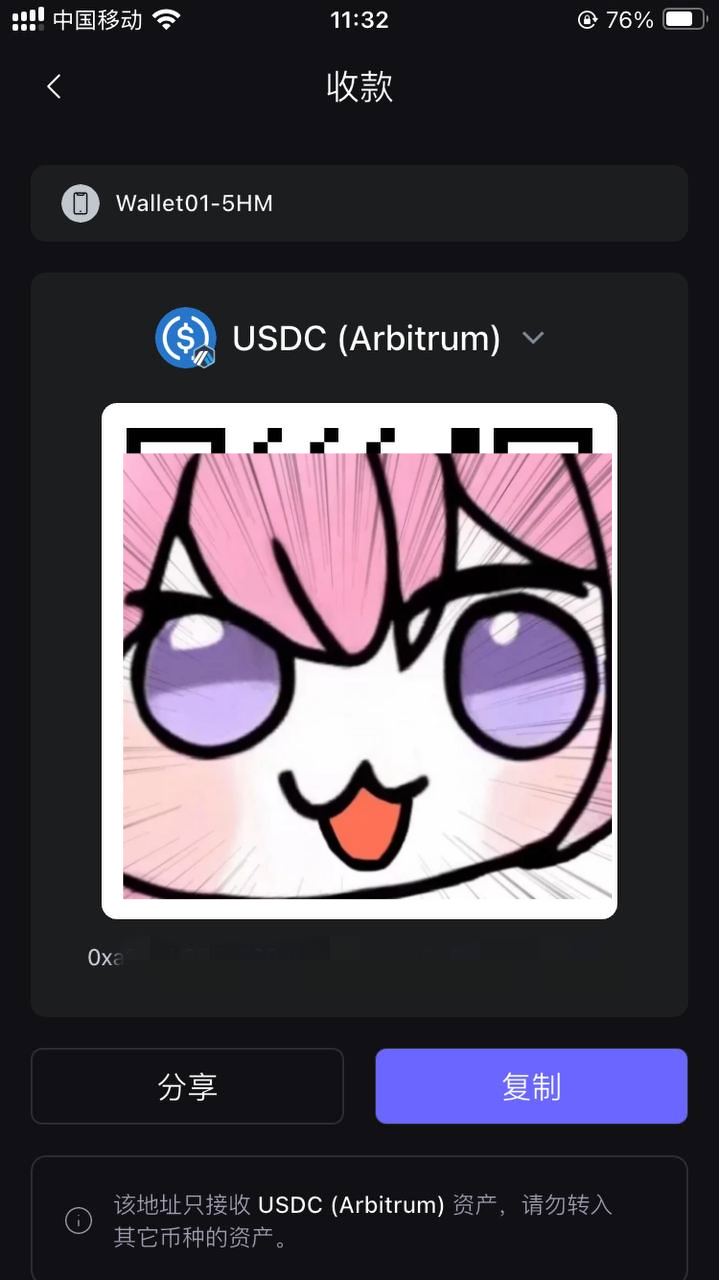 返回到Safepal钱包首页,点击:接收,选择USDC注意要选择Arbitrum链,复制:Arbitrum链地址