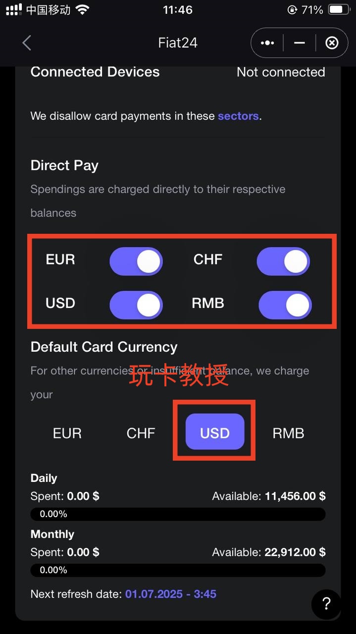 支付矿工费,点击:确认,激活成功后,点击:眼睛,可查看卡片详细,拉到下面,可设置默认货币和开启的货币,还可以看到每日的消费额度
